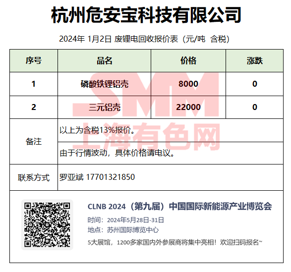 今日杭州危安宝,废锂电回收报价已更新,有货的朋友欢迎联系我们!