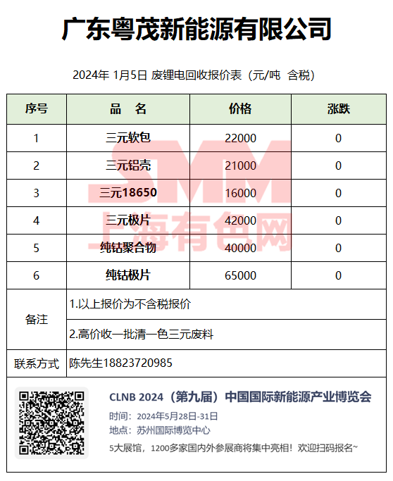 1月5日广东粤茂 废锂电回收报价