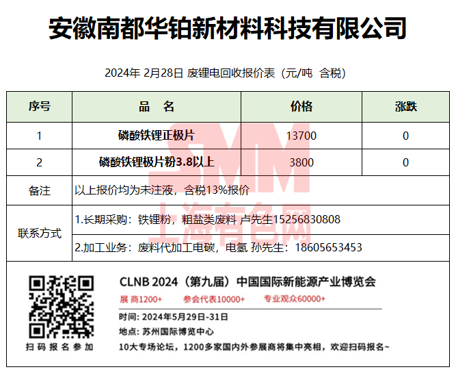 2月28日安徽华铂 废锂电回收报价