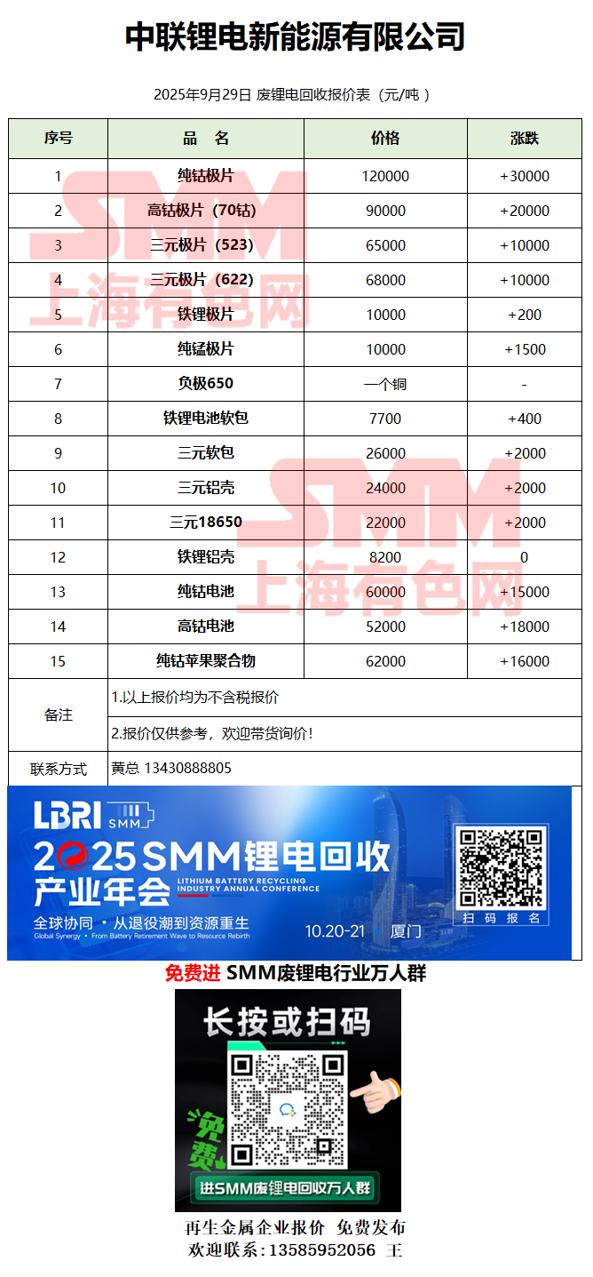9月29日中联锂电 废锂电采购报价