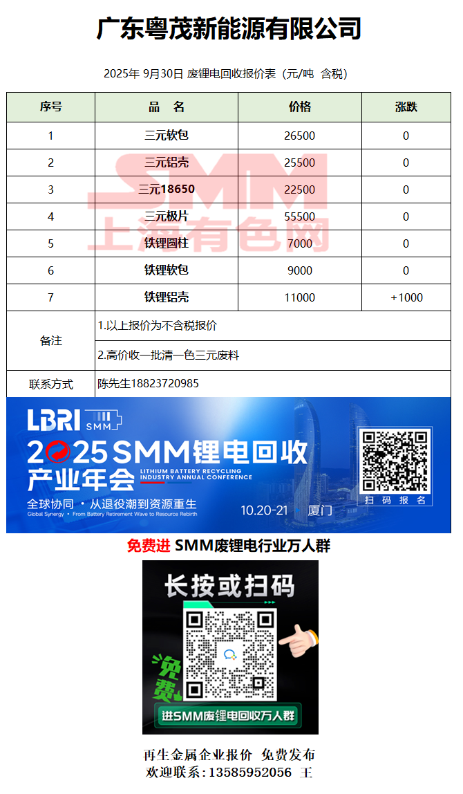 9月30日广东粤茂 废锂电采购报价