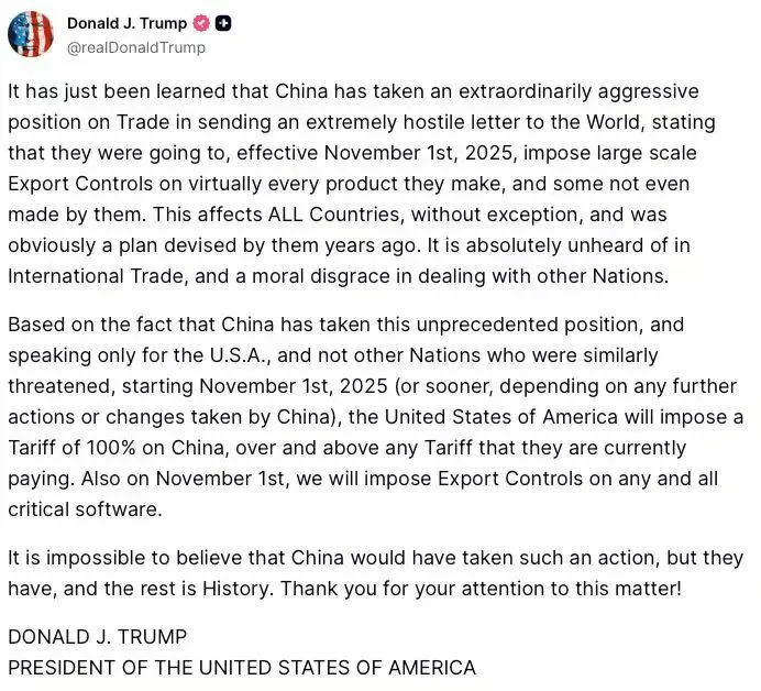 特朗普宣布的100%额外关税与关键软件出口管制,其核心属性是一场战略博弈而非最终定局。该声明的生效时间与具体执行均与中国未来的行动挂钩,这为后续谈判留下了充分的回旋空间。从历史经验看,2018-2019年的贸易战正是在“威胁-加税-谈判-豁免”的循环中推进的。因此,行业普遍视此举为新一轮激烈博弈的序幕,其目的在于为美国在后续谈判中创造筹码,而非意图彻底执行。该政策在美国国内也面临巨大阻力,其大幅推高通胀、重创本土新能源产业的后果,将与美联储的政策目标及地方经济利益相悖,其政治可持续性存疑。