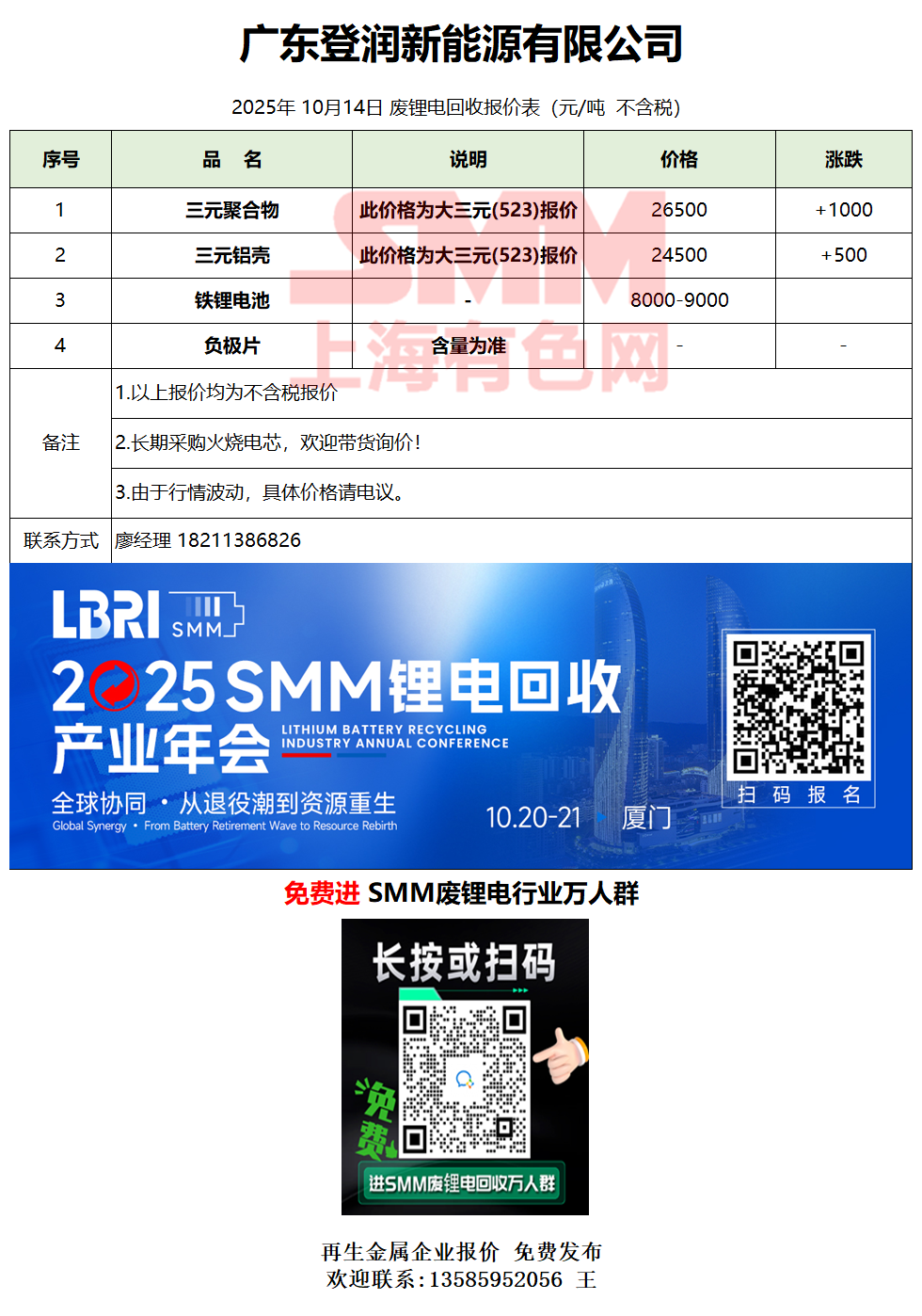 今日广东登润 废锂电采购报价已更新,有货的朋友欢迎联系我们!