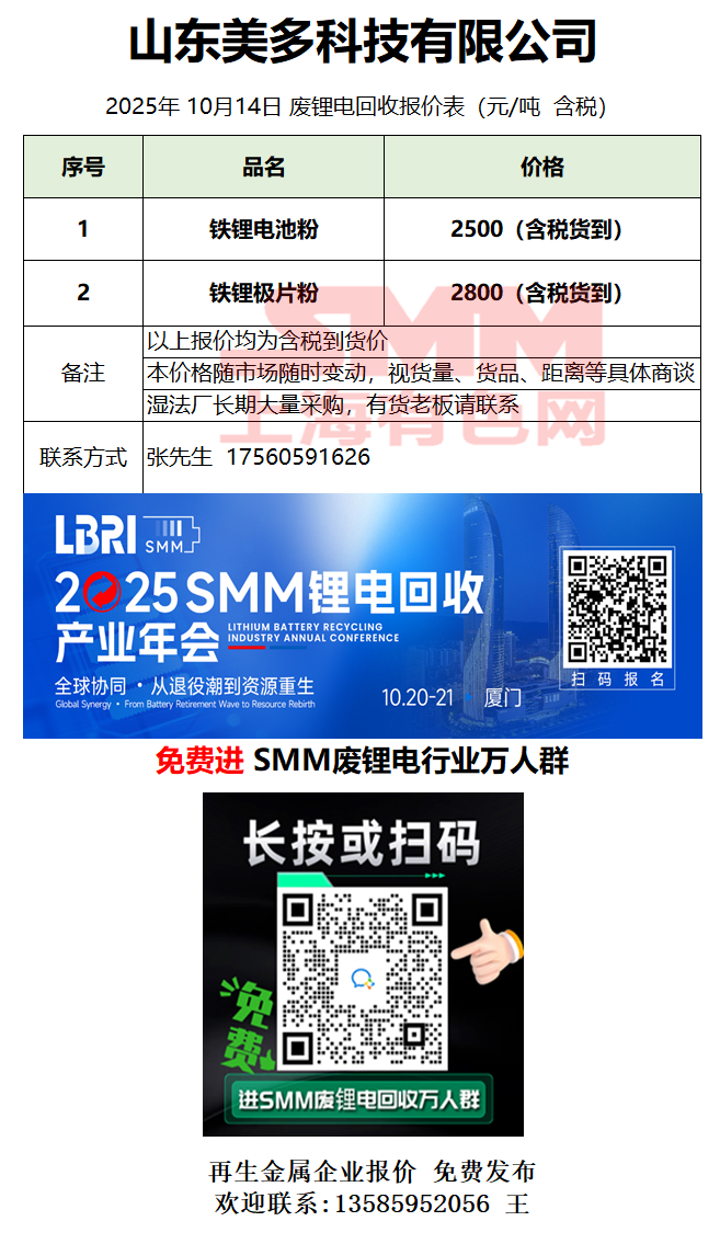 今日山东美多 废锂电采购报价已更新,有货的朋友欢迎联系我们!