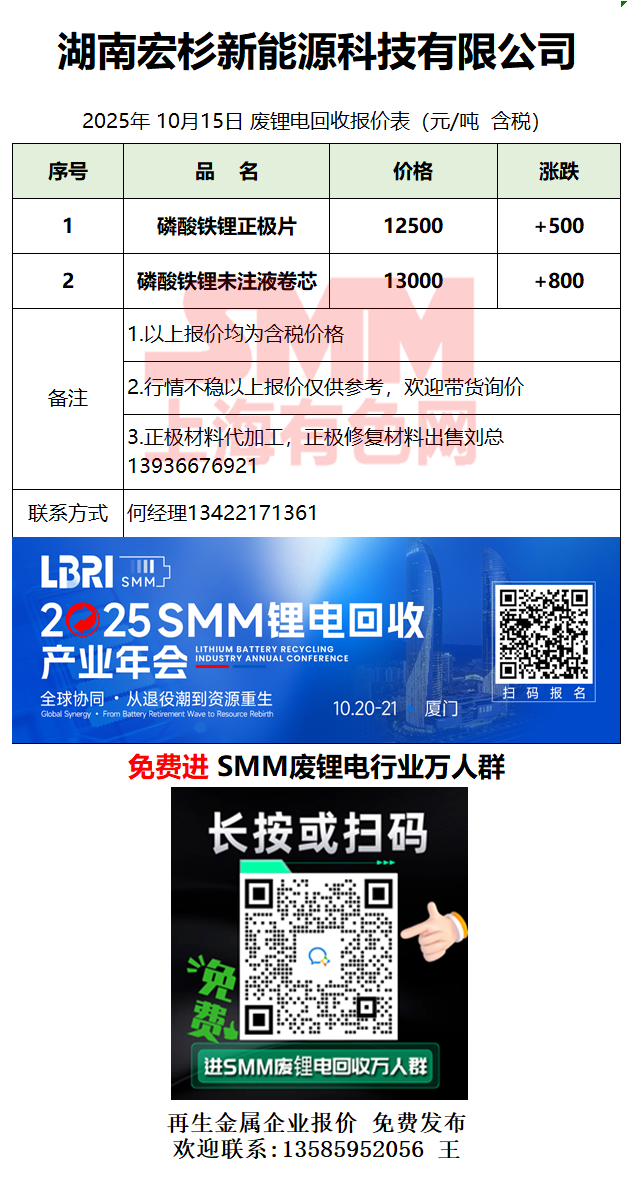 10月15日湖南宏杉 废锂电采购报价