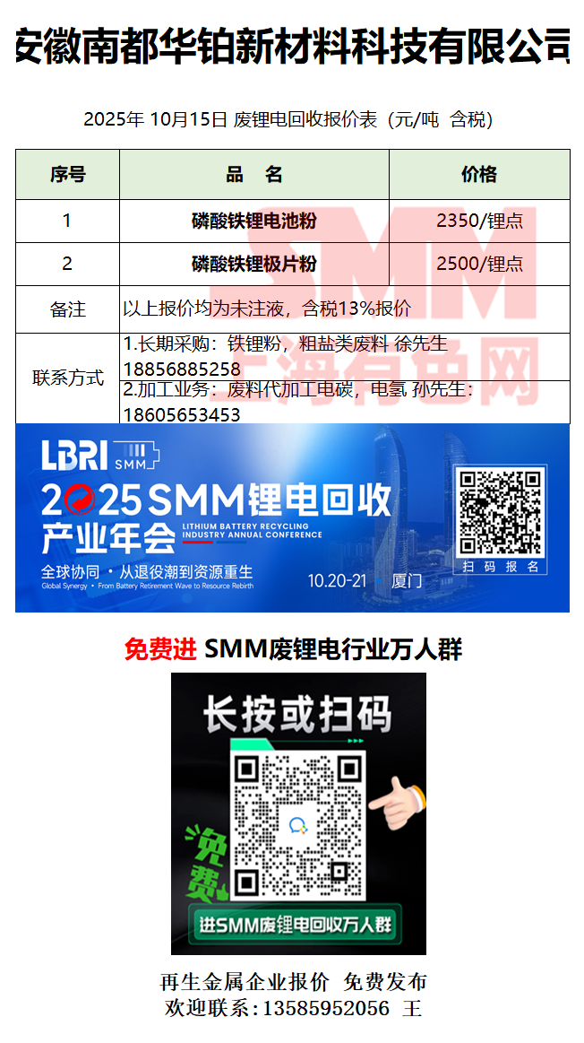 10月15日安徽华铂 废锂电采购报价
