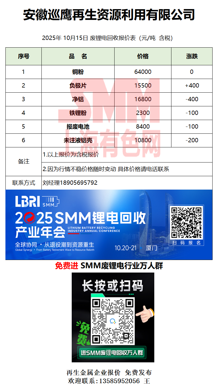 10月15日安徽巡鹰 废锂电采购报价