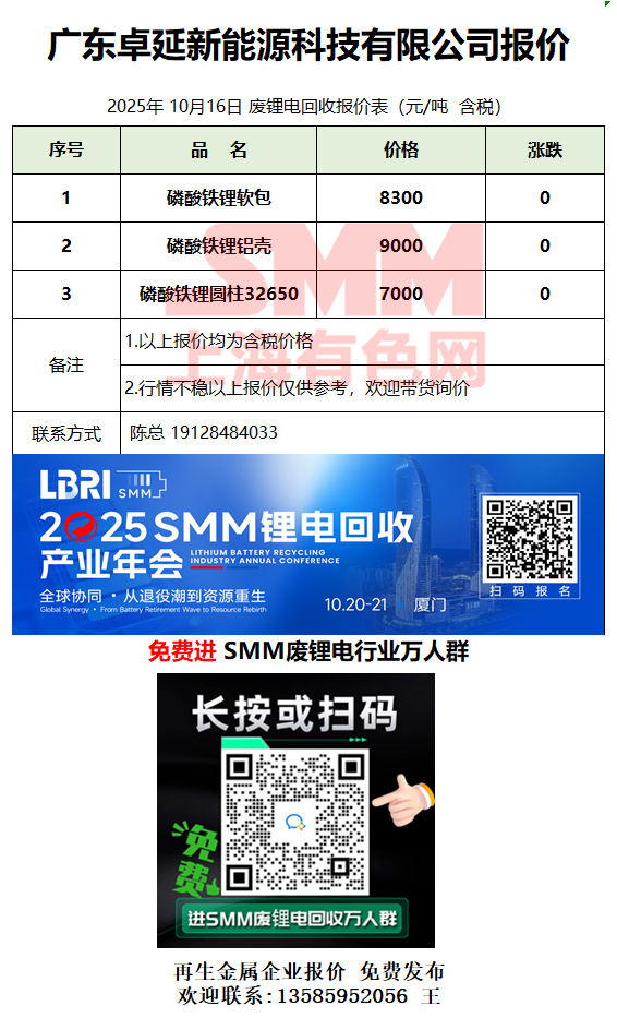 今日广东卓延 废锂电采购报价已更新,有货的朋友欢迎联系我们!