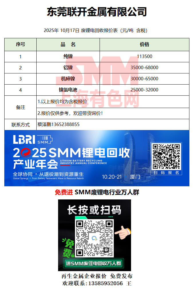 10月17日东莞联开 废锂电采购报价