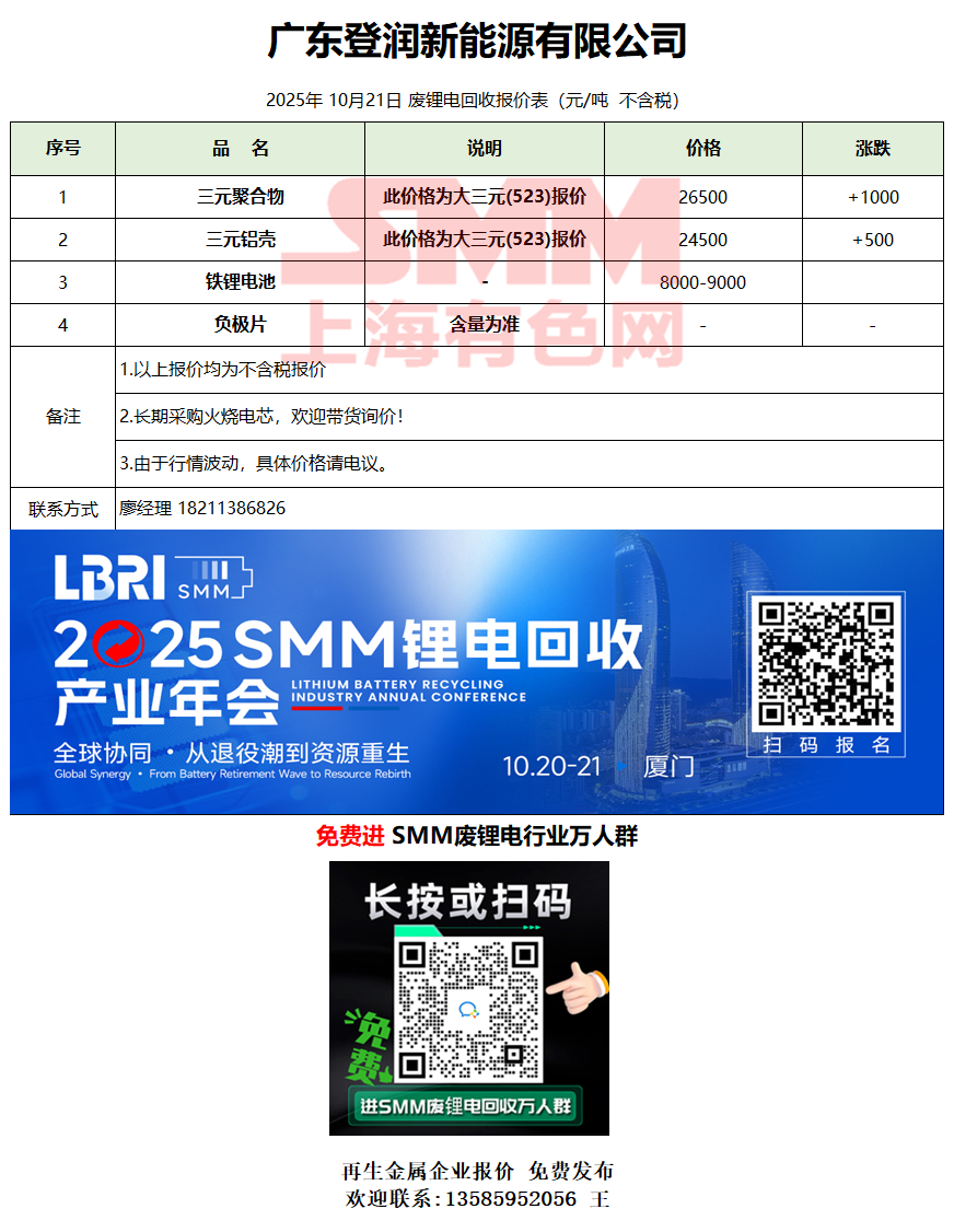 今日广东登润 废锂电采购报价已更新,有货的朋友欢迎联系我们!