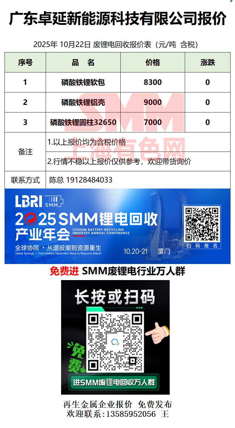 10月22日广东卓延 废锂电采购报价