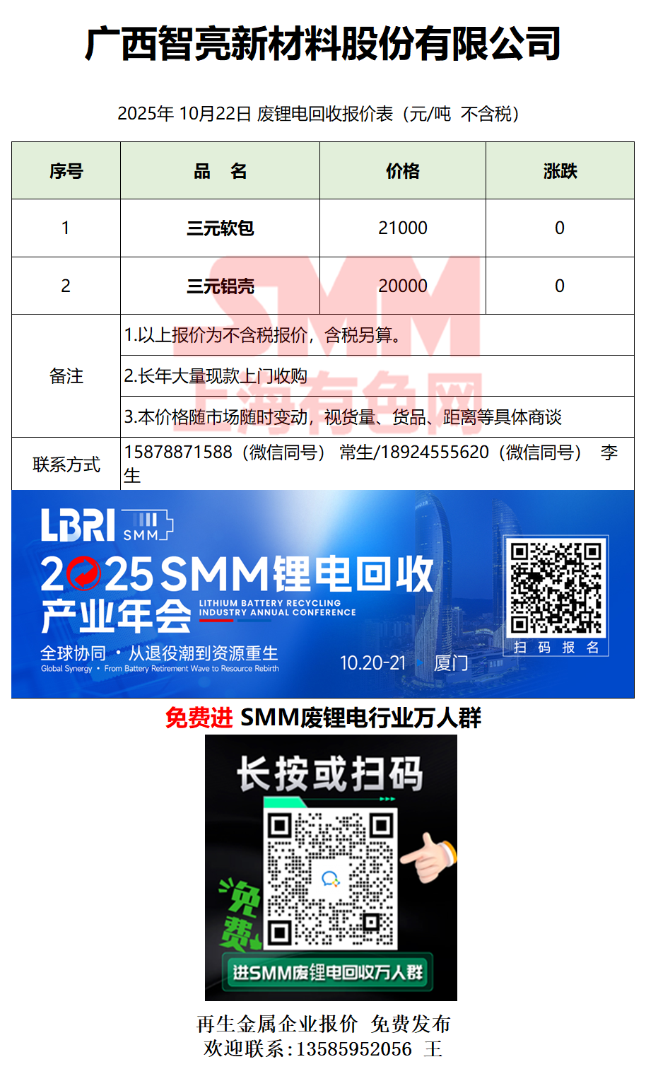 今日广西智亮 废锂电采购报价已更新,有货的朋友欢迎联系我们!
