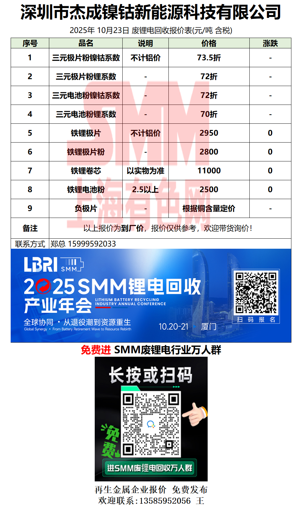 10月23日杰成镍钴 废锂电采购报价