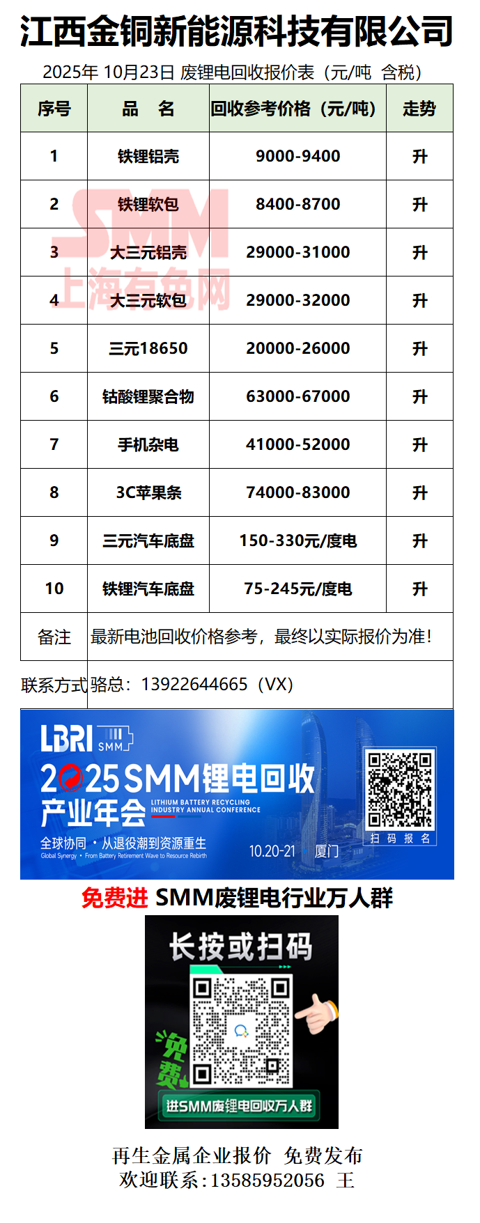 10月23日江西金铜 废锂电采购报价