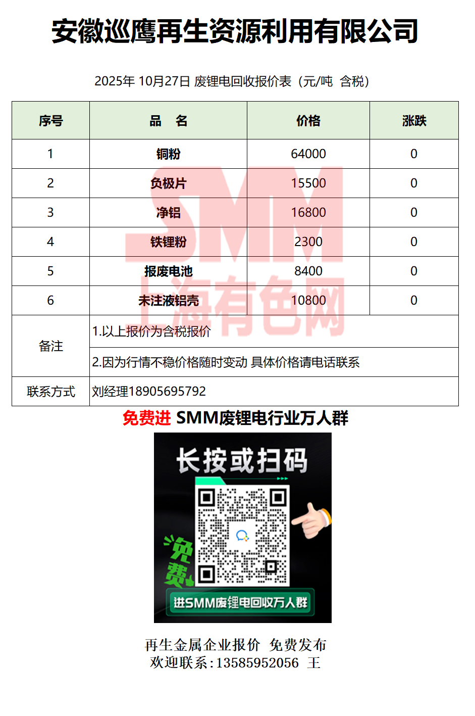 今日安徽巡鹰 废锂电采购报价已更新,有货的朋友欢迎联系我们!