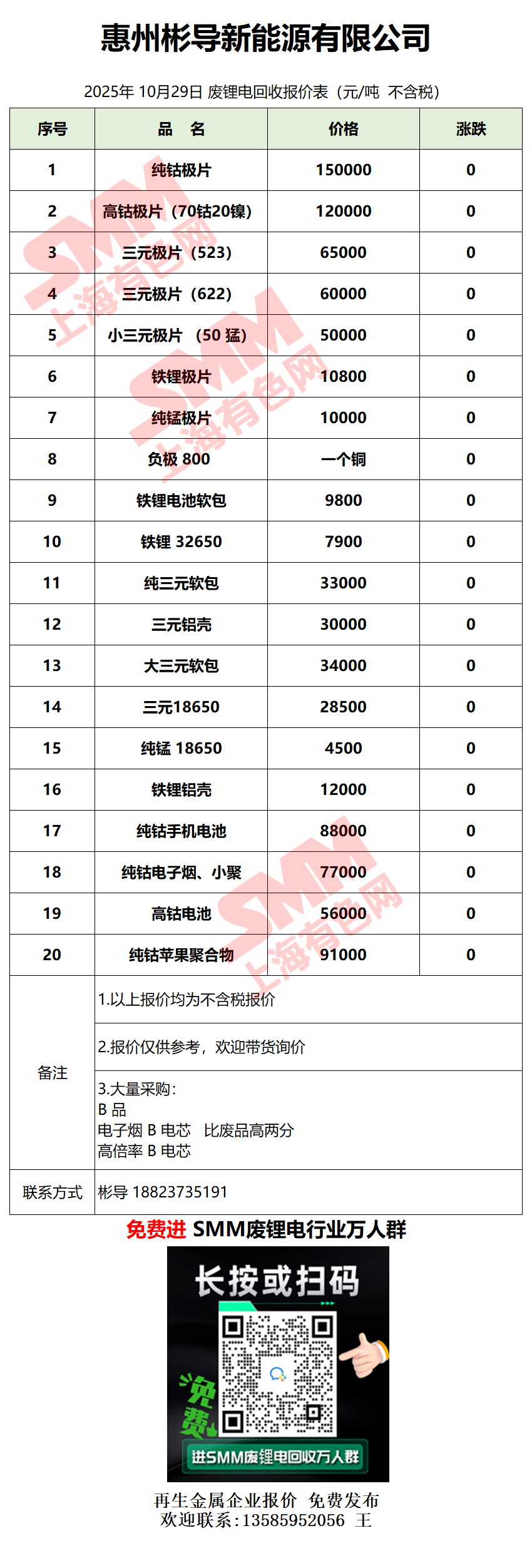 10月29日惠州彬导 废锂电采购报价