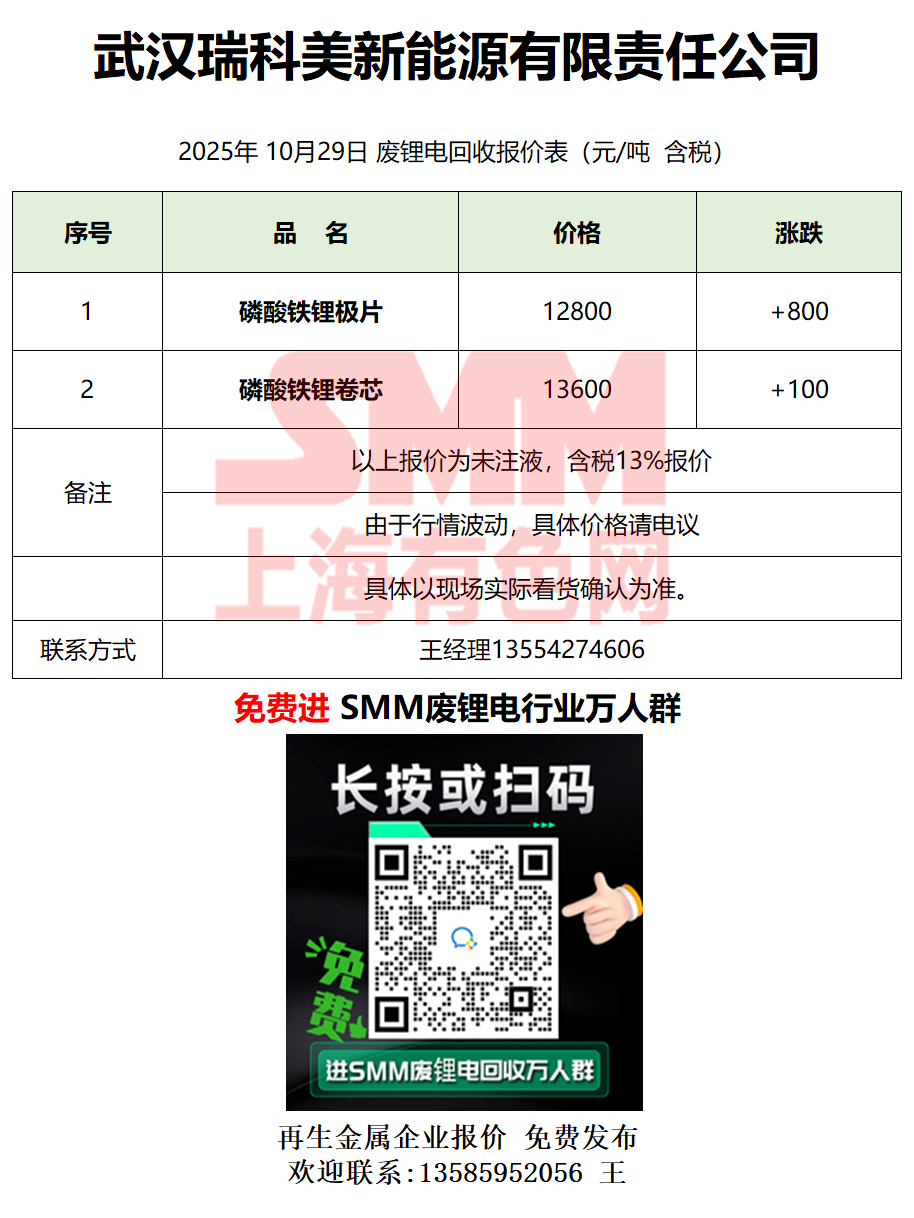 10月29日武汉瑞科美 废锂电采购报价