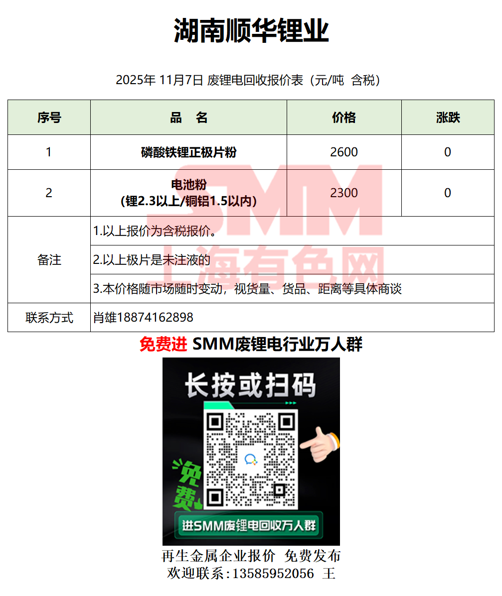 11月7日湖南顺华 废锂电采购报价