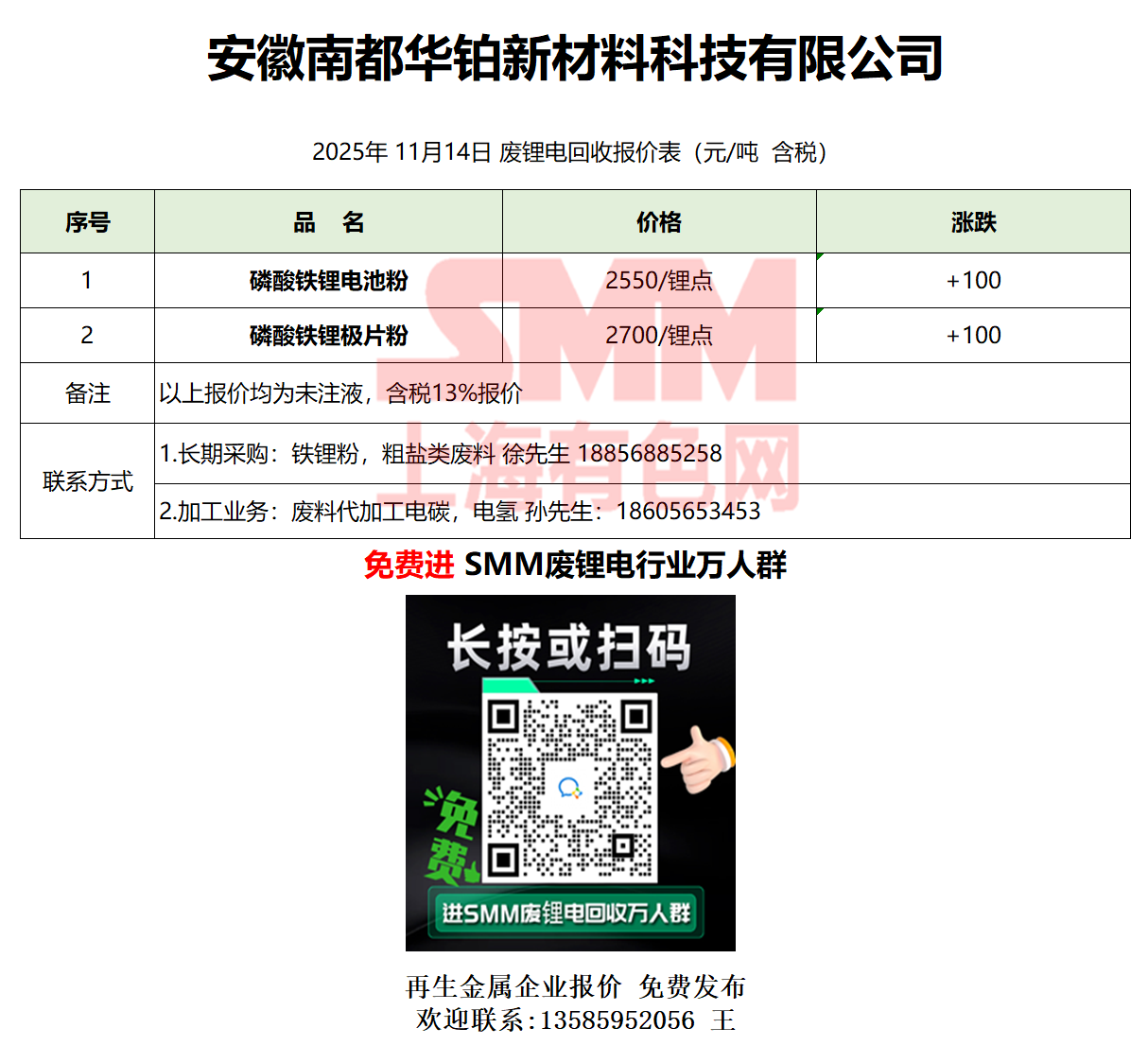 11月14日安徽华铂 废锂电采购报价