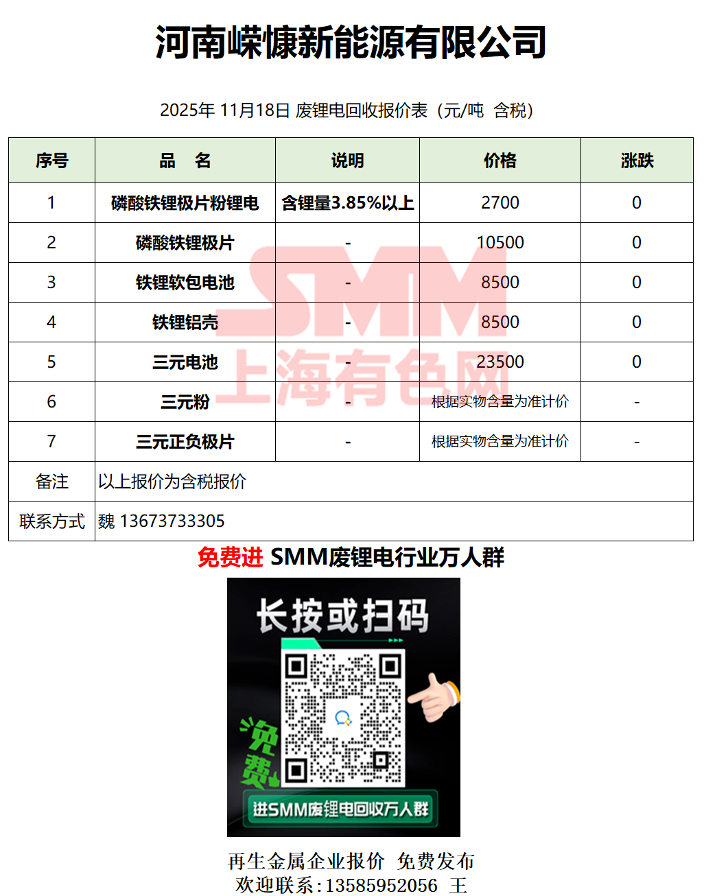 11月18日河南嵘慷 废锂电采购报价