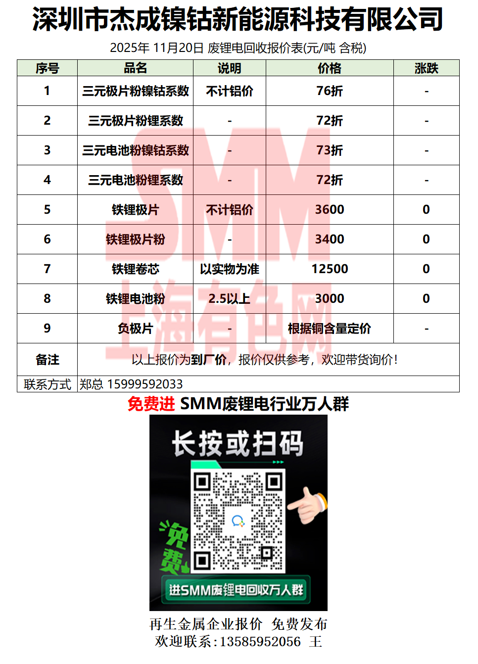 11月20日杰成镍钴 废锂电采购报价