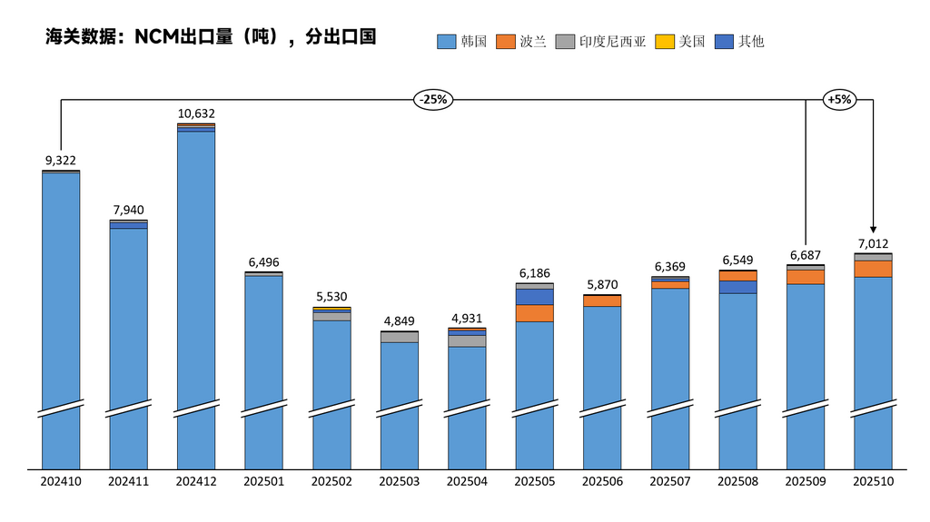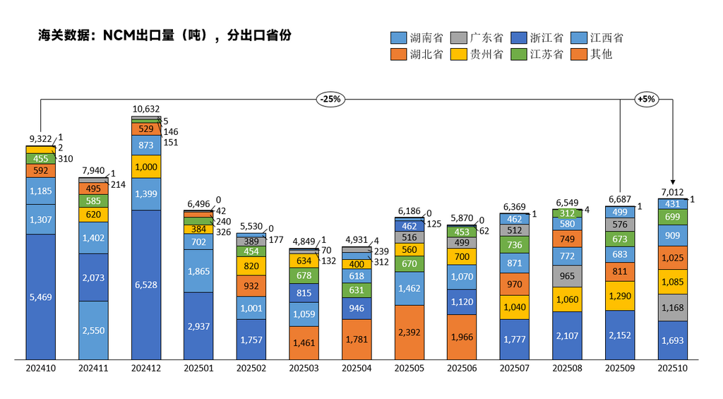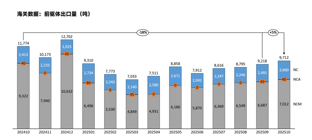 2025年10月,中国三元前驱体出口量为9712吨,环比增加5%,同比下降18%。