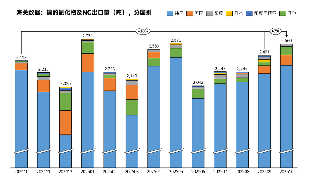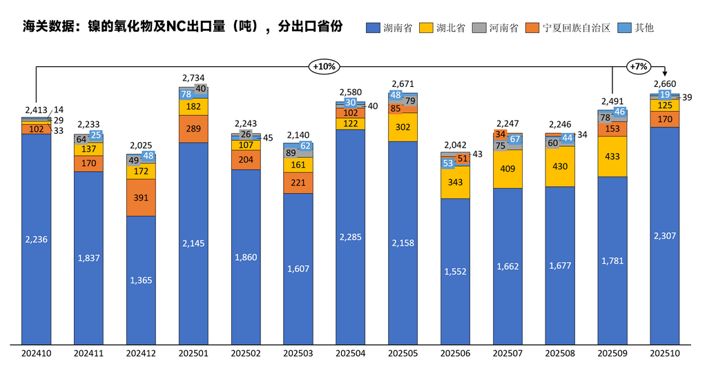 分出口省份来看,关于镍的氧化物及NC,2025年10月总出口2660吨,其中湖南省出口量为2307吨,占比87%,相比上月占比有所提升。排名第二的为宁夏回族自治区,出口量170吨。