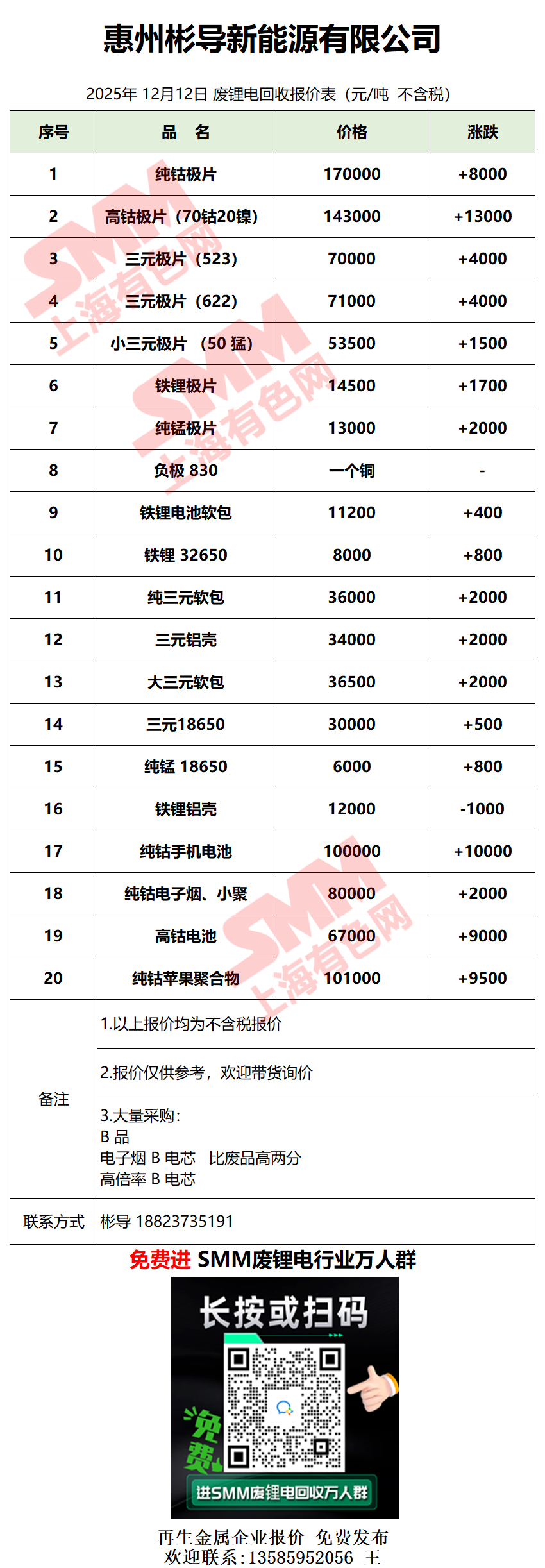 今日惠州彬导 废锂电采购报价已更新,有货的朋友欢迎联系我们!