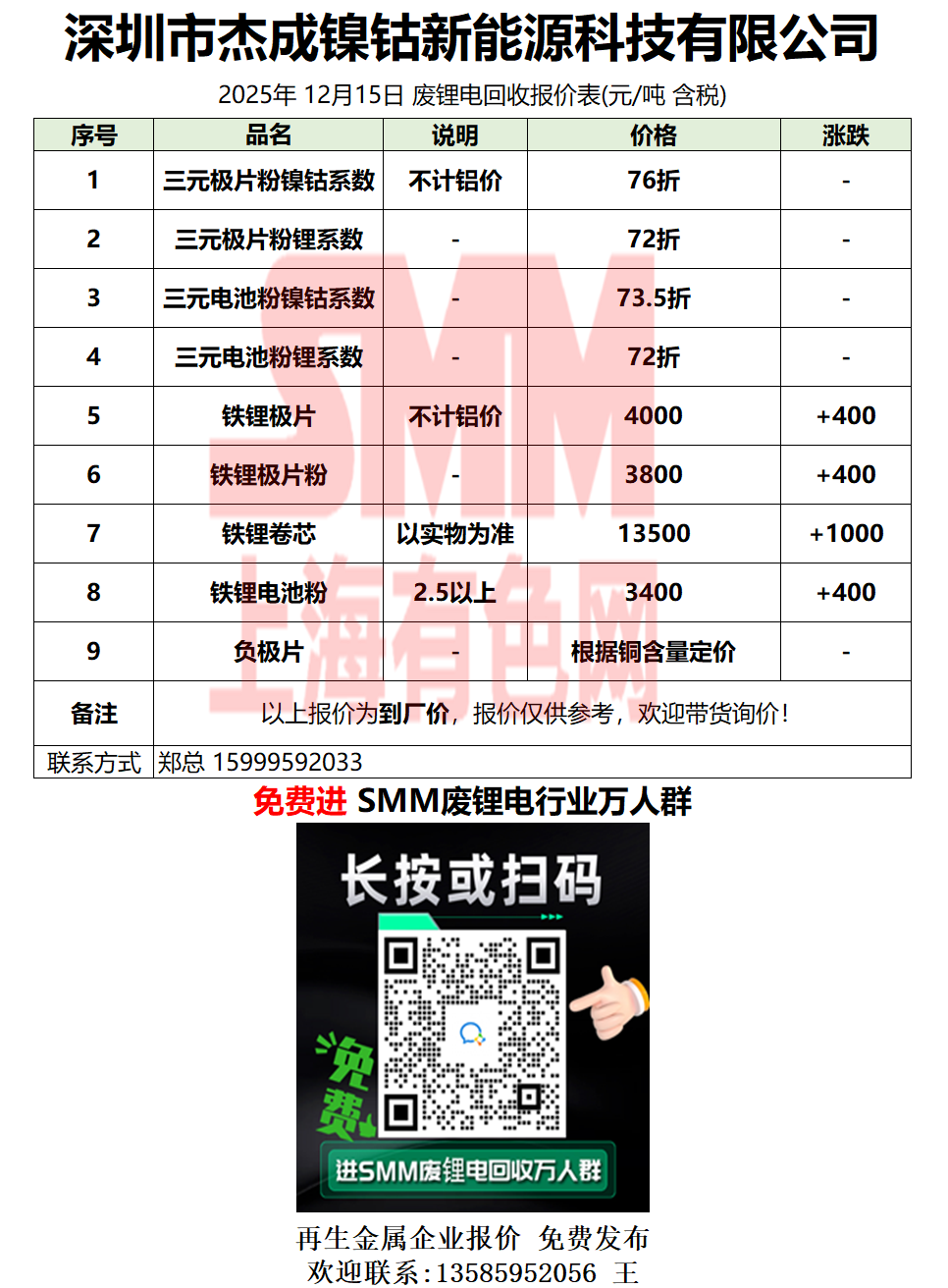 今日杰成镍钴 废锂电采购报价已更新,有货的朋友欢迎联系我们!