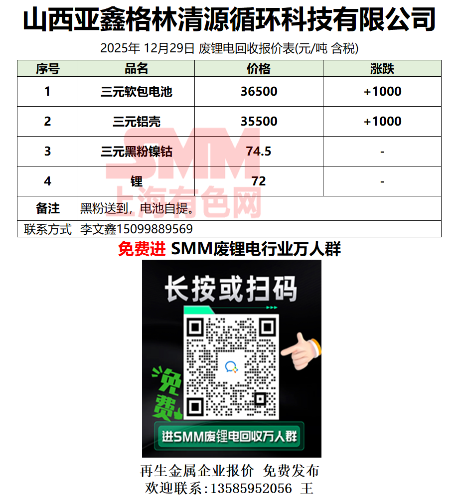 12月29日山西亚鑫 废锂电采购报价