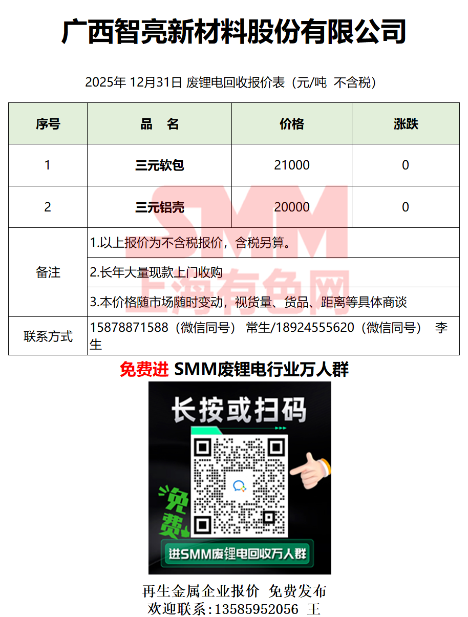 12月31日广西智亮 废锂电采购报价