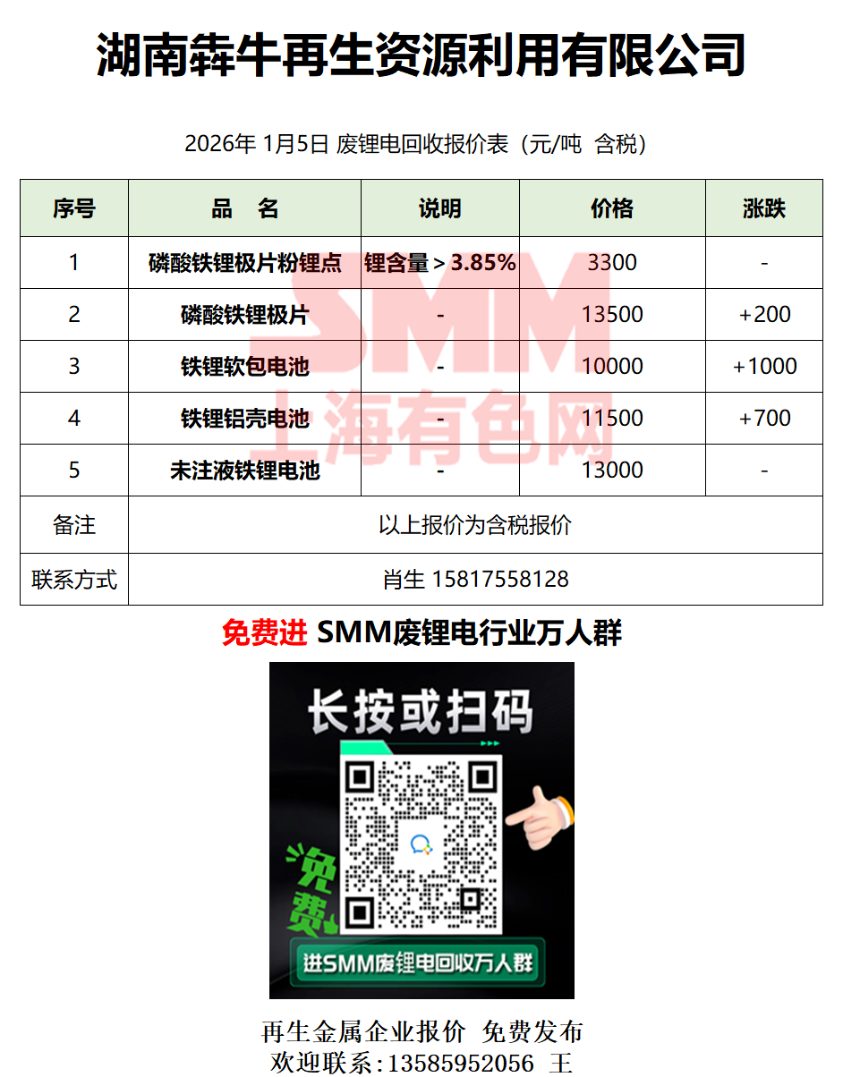 1月5日湖南犇牛 废锂电采购报价