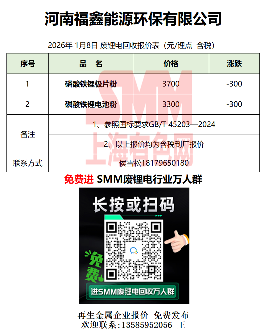 1月8日河南福鑫 废锂电采购报价