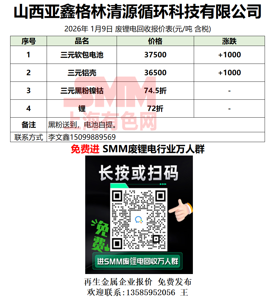 1月9日山西亚鑫 废锂电采购报价