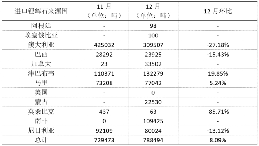 从来源国看,加拿大来矿显著增长,达3.35万吨;津巴布韦来矿13.22万吨,环比增加19.85%;马里来矿12月到港7.70万吨,环比增加5.24%;受到11月来矿高位影响,12月来自澳大利亚的锂精矿进口量级有一定回落,达30.95万吨,环比减少27.18%;尼日利亚来矿同样有小幅下调,达8万吨,环比减少13.12%。
