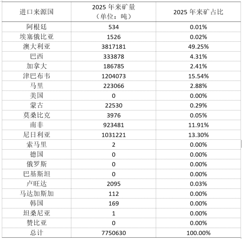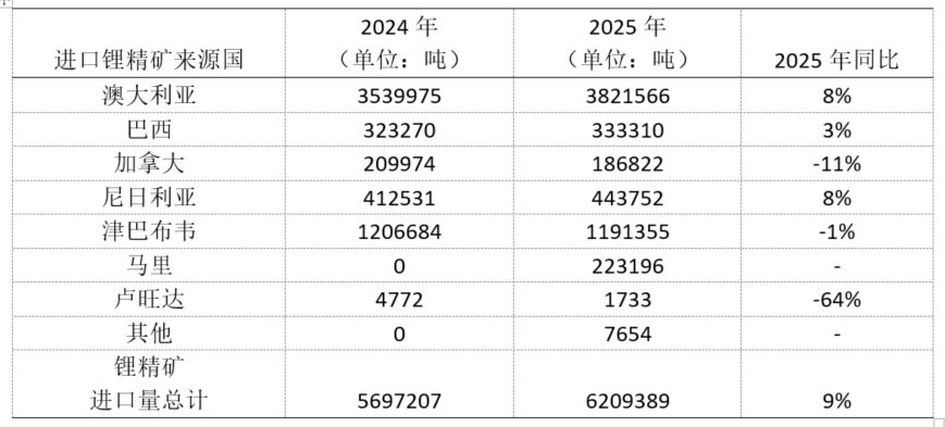 【SMM分析】2025年中国进口锂矿775.06万吨 锂精矿进口量级同比增加9%