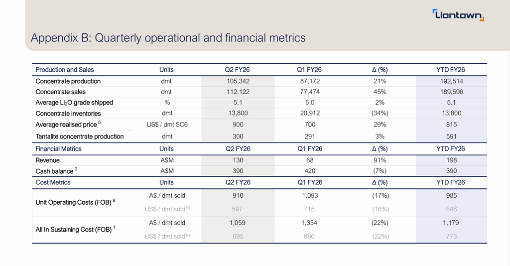 近期,澳洲矿商Liontown公布了其下属矿山Kathleen Valley2025年Q4生产销售情况,及2026年部分计划,以下是简要内容: