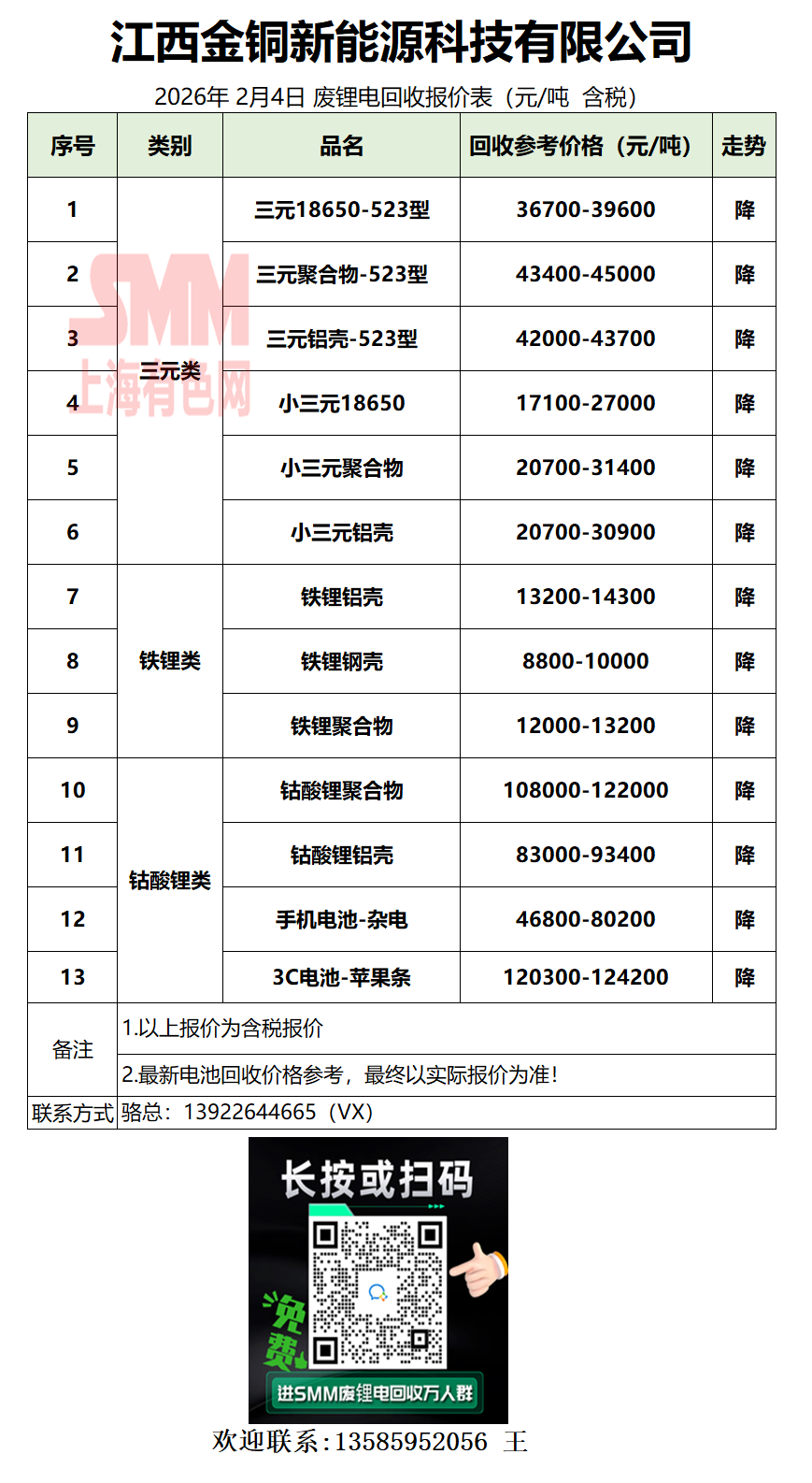 2月4日江西金铜 废锂电采购报价