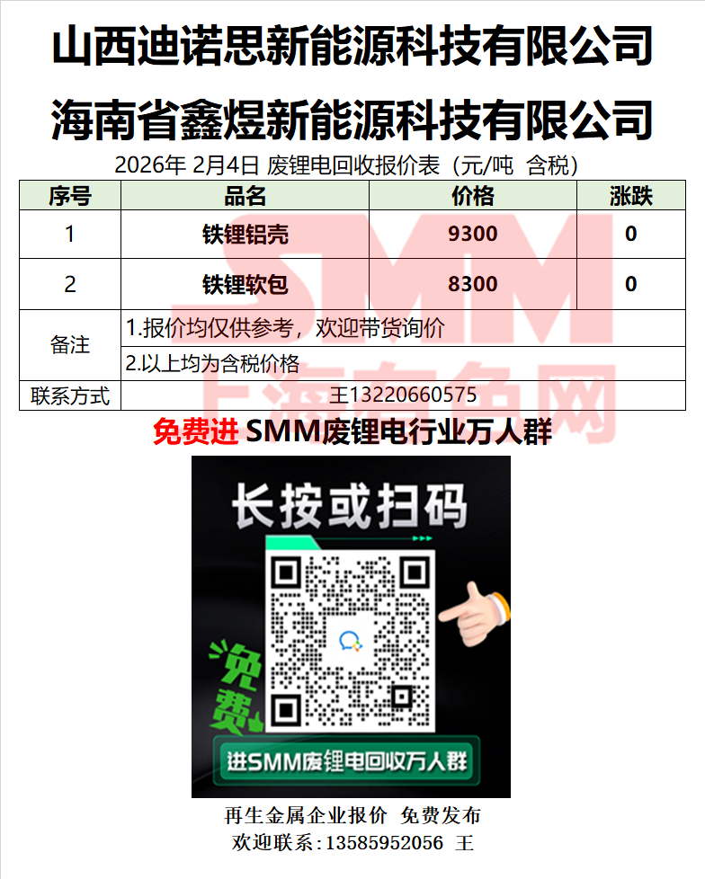 2月4日山西迪诺思 废锂电采购报价