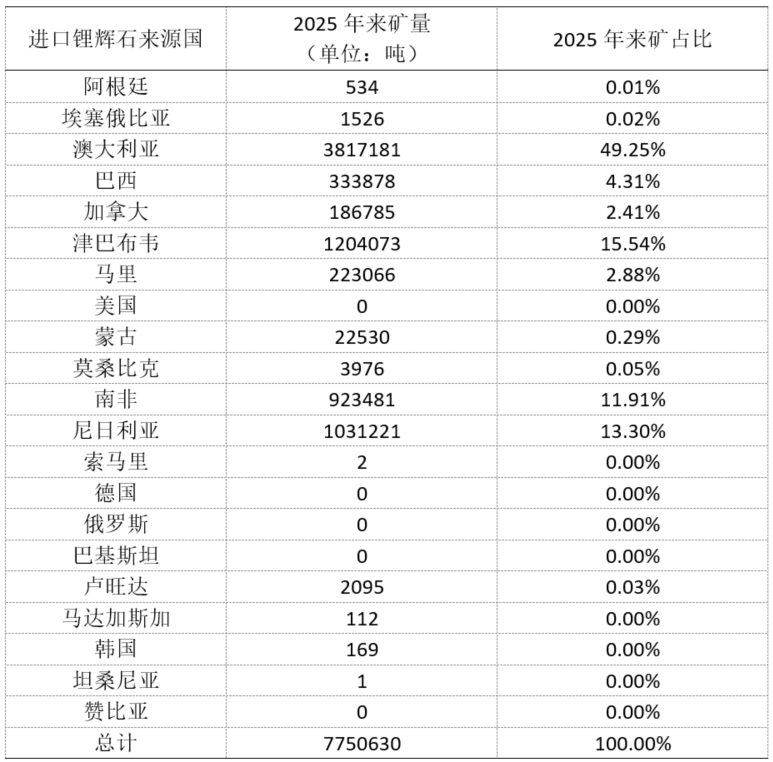 4、从2025年中国进口锂辉石矿来看,津巴布韦来矿超120万吨,占中国总进口量级的15%左右。