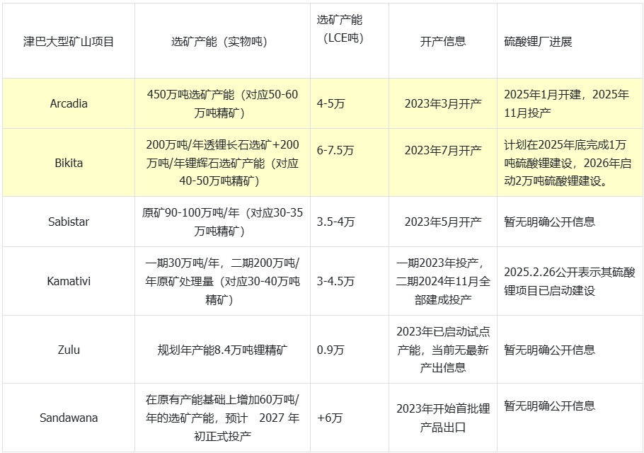 Arcadia项目和Bikita项目在2024年按照津巴布韦矿业部门要求提交了冶选计划。Arcadia项目2025年1月正式开建,硫酸锂项目初始设计产能5万吨,2025年10月进入调试,近期处于爬坡状态,但其硫酸锂出口在2月中旬及下旬出现一定延期;Bikita项目在2025年5月的投资者关系发布会公开表示,计划在2025年底完成1万吨硫酸锂建设,2026年启动2万吨硫酸锂建设;Kamativi项目2026年2月26日公开表示其津巴布韦硫酸锂项目已经启动建设。