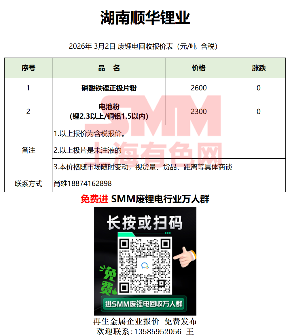 3月2日湖南顺华 废锂电采购报价