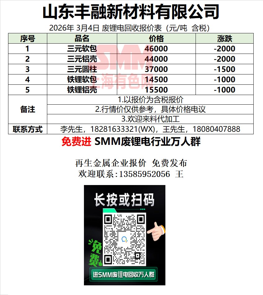 3月4日山东丰融 废锂电采购报价