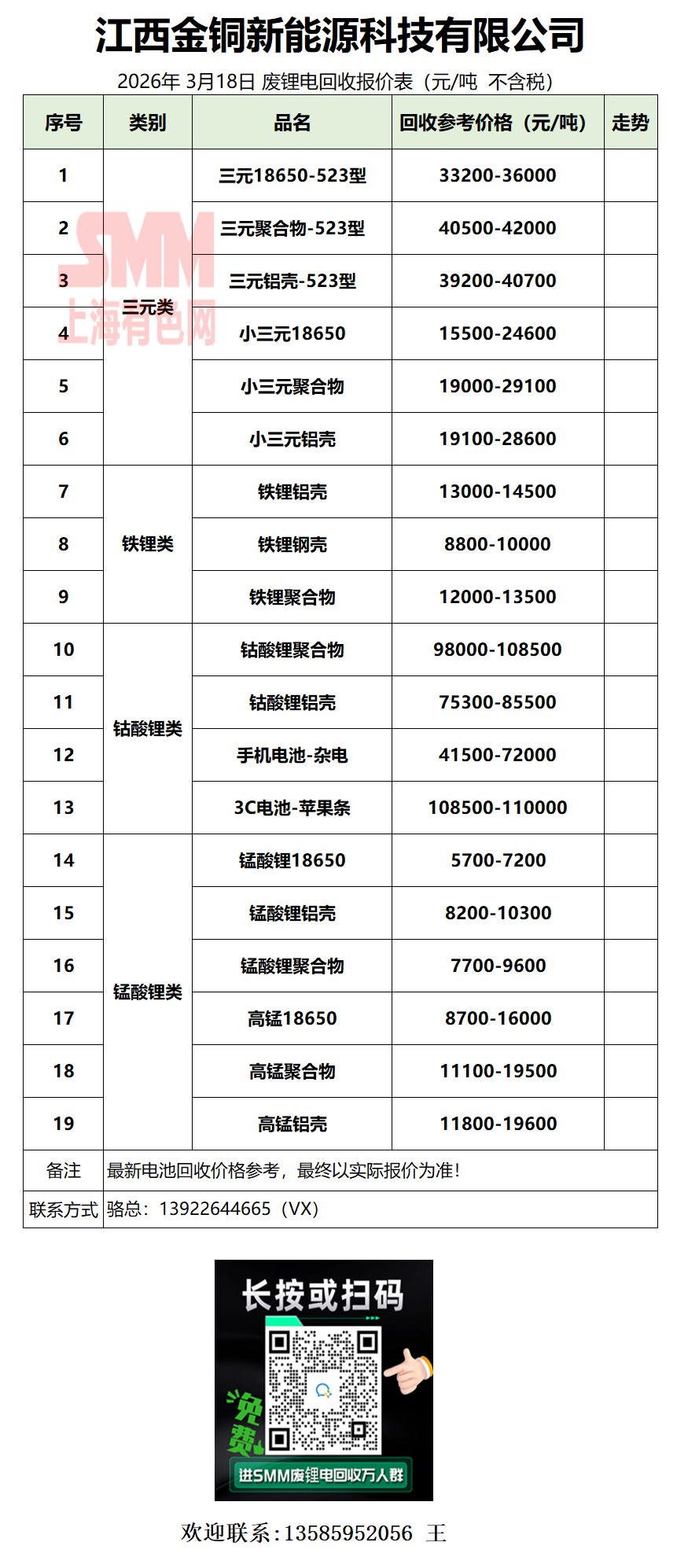 3月18日江西金铜 废锂电采购报价