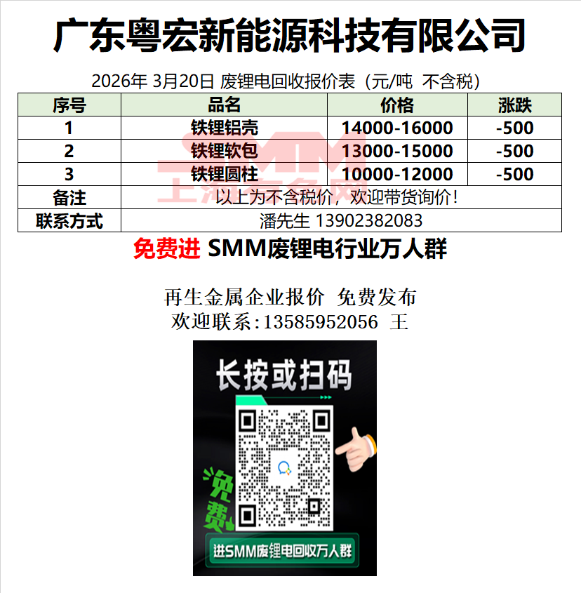 3月20日广东粤宏 废锂电采购报价