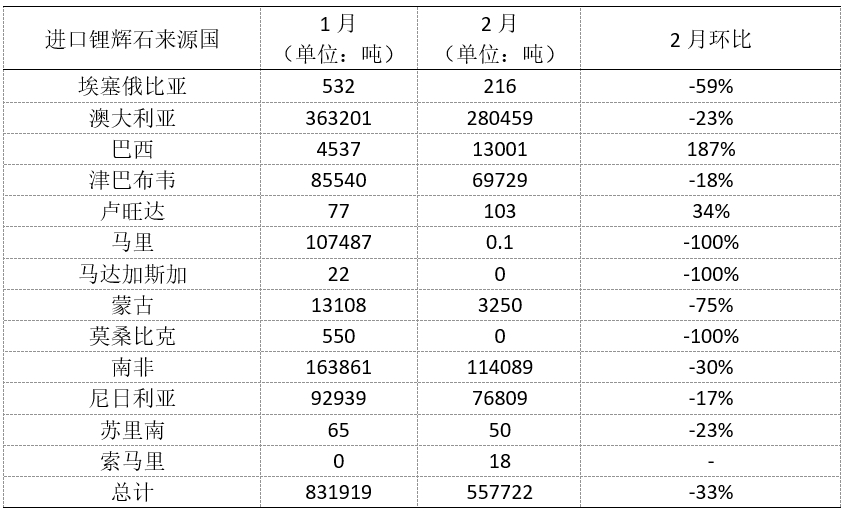 另外,经SMM模型筛选分析,1月进口锂辉石折合碳酸锂当量约8.4万吨;锂精矿量达63.6万实物吨,占比76%;2月进口锂辉石折合碳酸锂当量5.0万吨;锂精矿量达43.8万实物吨吨,占比79%。