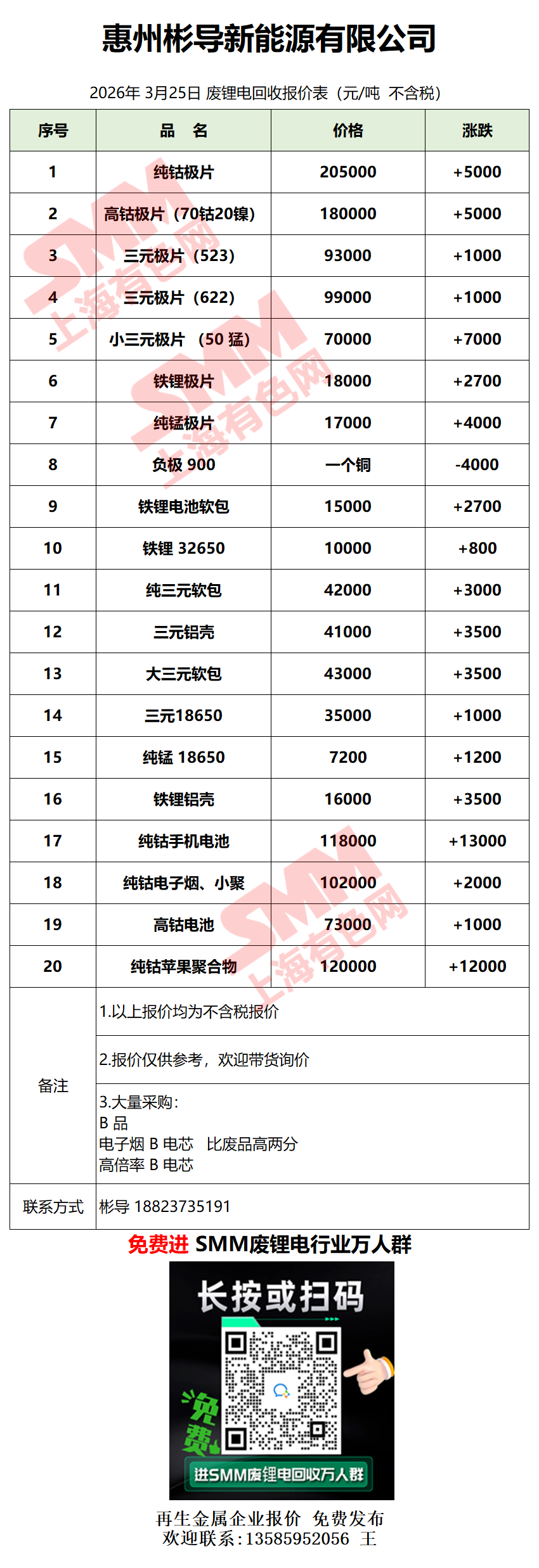 3月25日惠州彬导 废锂电采购报价