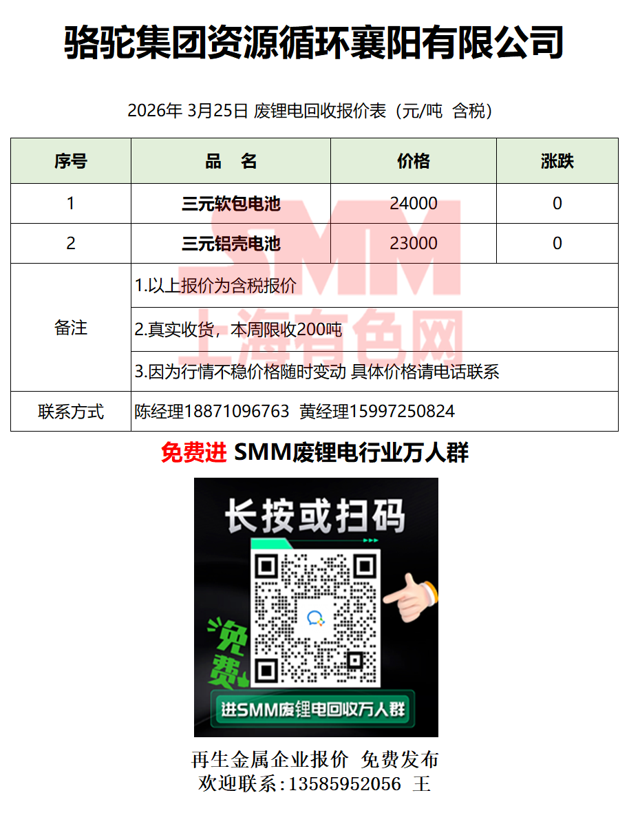 3月25日骆驼集团 废锂电采购报价