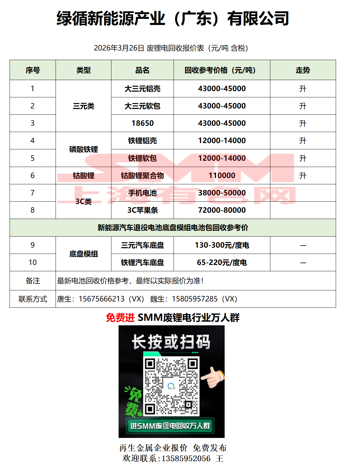 3月26日绿循新能源 废锂电采购报价
