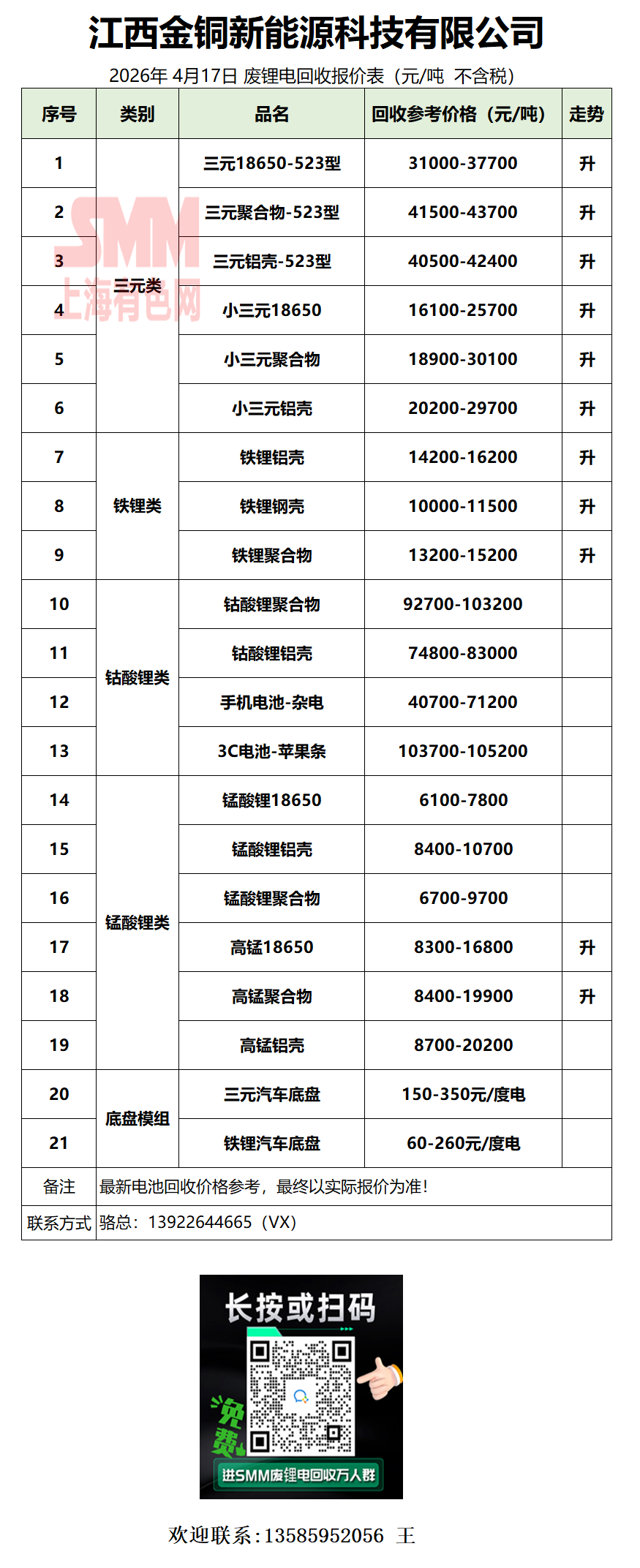 4月17日江西金铜 废锂电采购报价